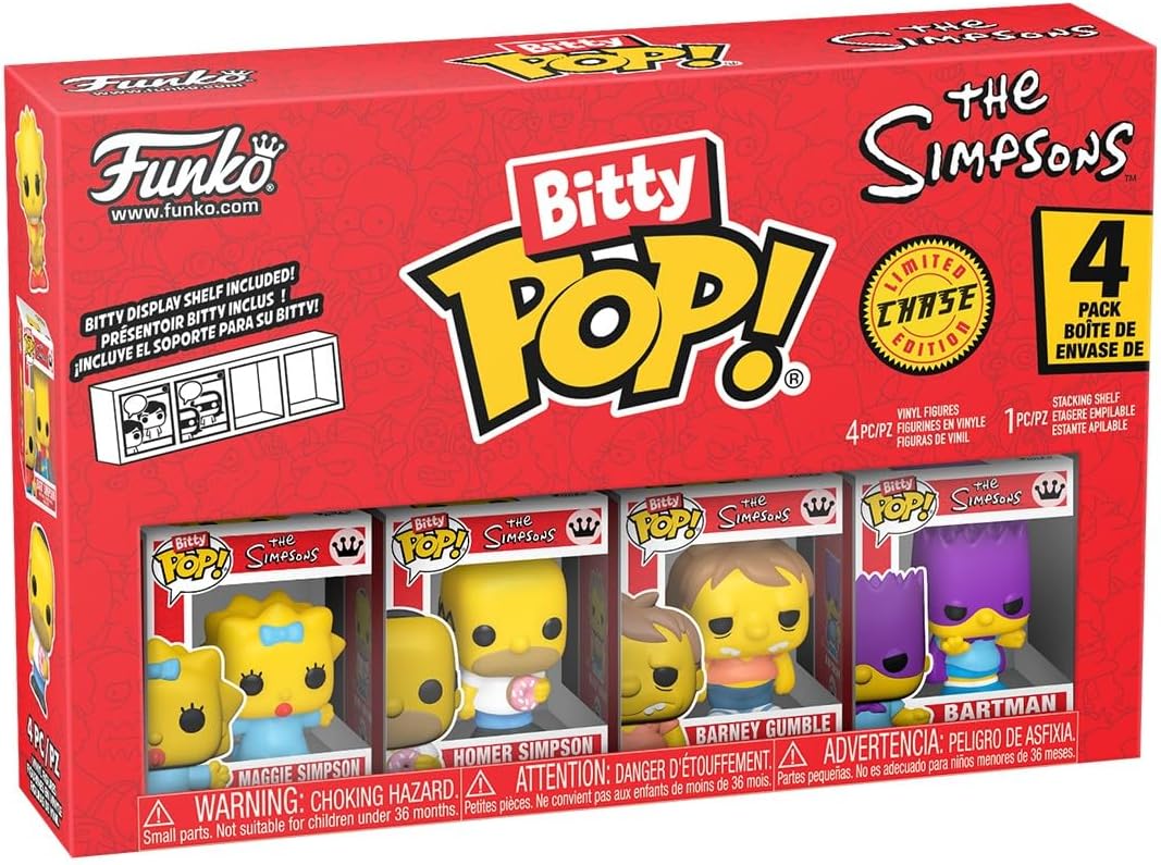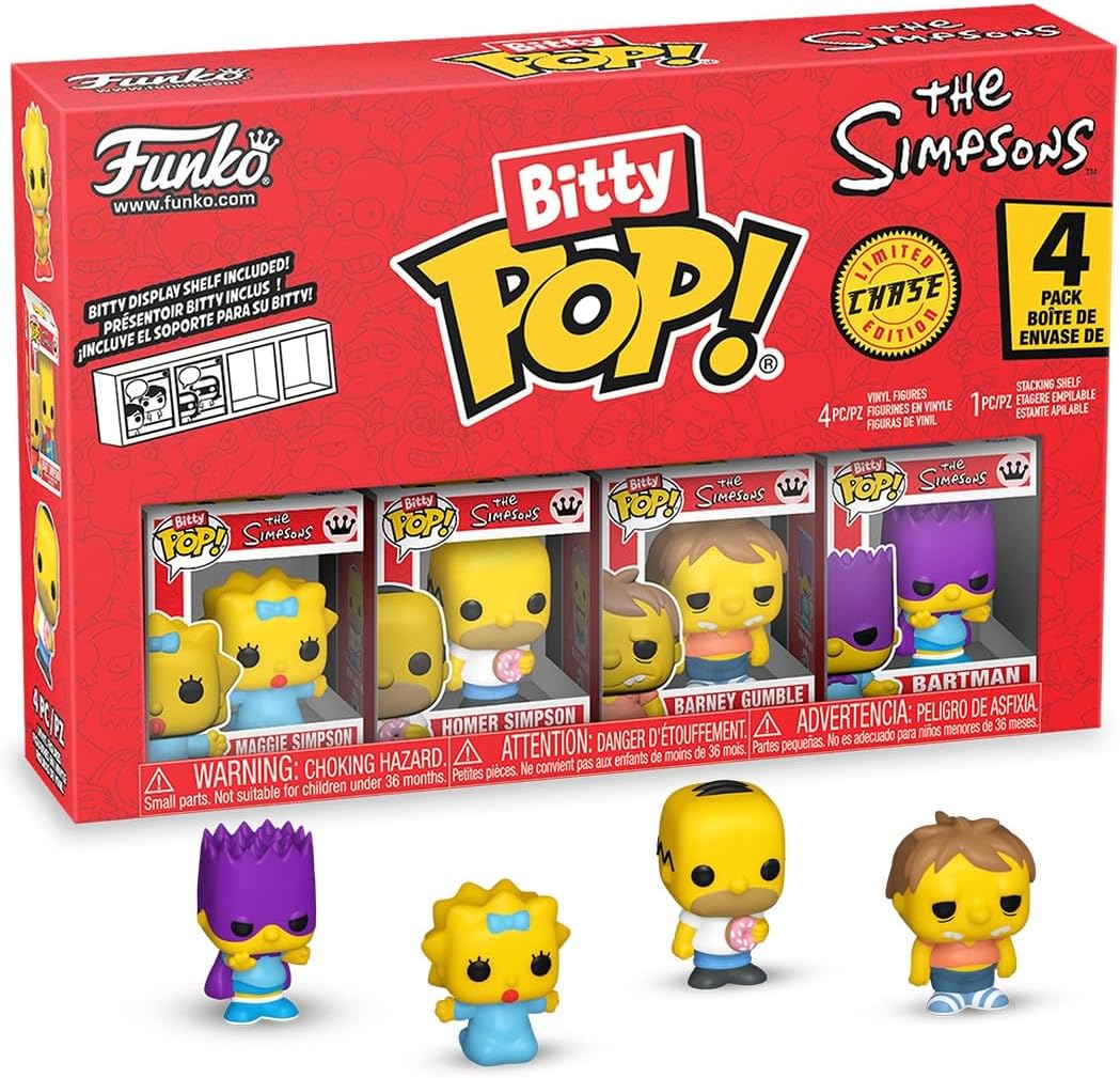 Expand your The Simpsons Bitty Pop! collection with this 4-pack featuring Maggie Simpson, Homer Simpson, Barney Gumble, and a random Bitty Pop! figure. Bitty Pop! mini-figures come packaged in hard acrylic cases with detachable bottom lids. The detachable bottom lids double as acrylic bases, to which the Bitty Pop! mini-figures are adhered. Sort and arrange your Bitty Pop! collectibles with the included display case! Acrylic display cases are stackable and hold 4x Bitty Pop! mini-figures. The Simpsons Maggie Simpson Funko Bitty Pop! Mini-Figure 4-Pack comes packaged in a window display box. For ages 3 years and up.